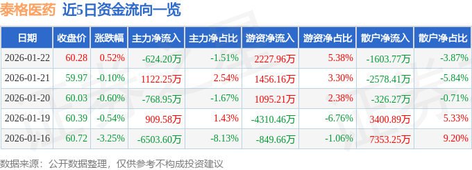 证券之星消息,截至2026年1月22日收盘,泰格医药(300347)报收于60.28元,上涨0.52%,换手率1.22%,成交量6.9万手,成交额4.14亿元。