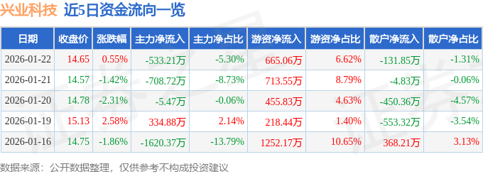 证券之星消息,截至2026年1月22日收盘,兴业科技(002674)报收于14.65元,上涨0.55%,换手率2.33%,成交量6.8万手,成交额1.01亿元。