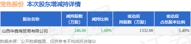 证券之星消息,1月22日宝色股份发布公告《宝色股份:关于持股5%以上股东减持股份触及1%整数倍暨减持计划实施完毕的公告》,其股东山西华鑫海贸易有限公司于2026年1月19日至2026年1月21日间合计减持246.0万股,占公司目前总股本的0.9968%,变动期间该股股价上涨0.81%,截止1月21日收盘报22.52元。
