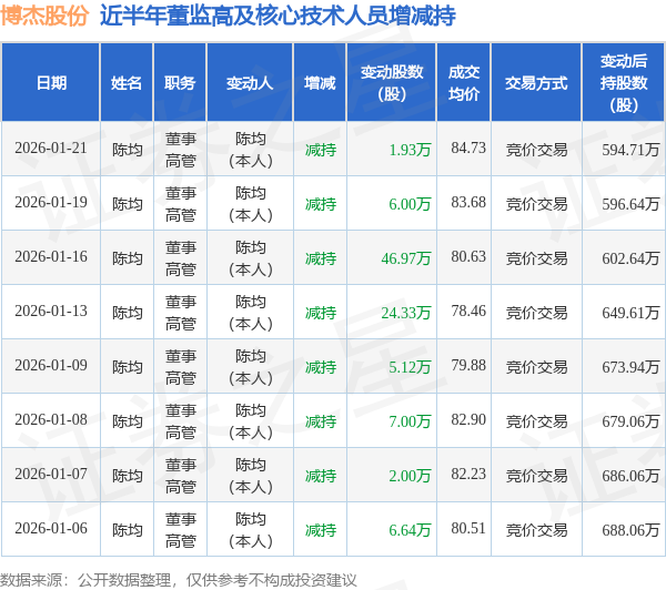 博杰股份近半年内的董监高及核心技术人员增减持详情如下:
