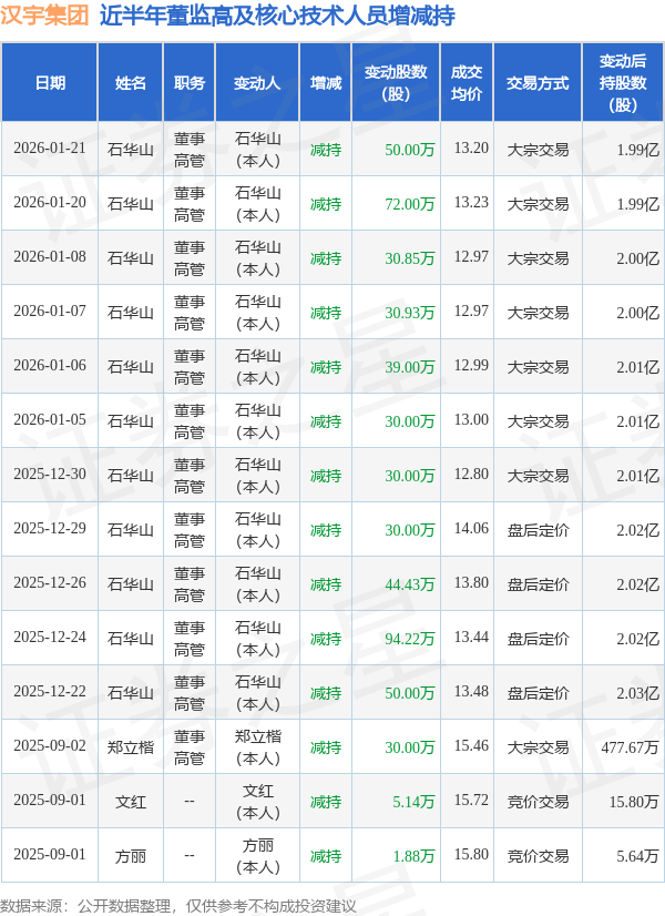 汉宇集团近半年内的董监高及核心技术人员增减持详情如下: