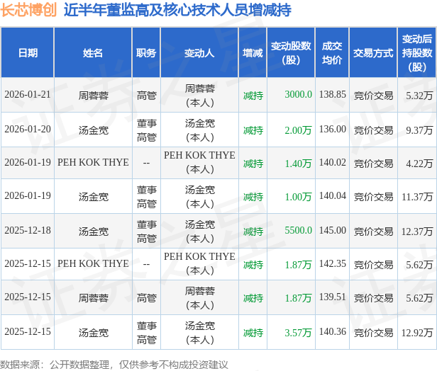 长芯博创近半年内的董监高及核心技术人员增减持详情如下: