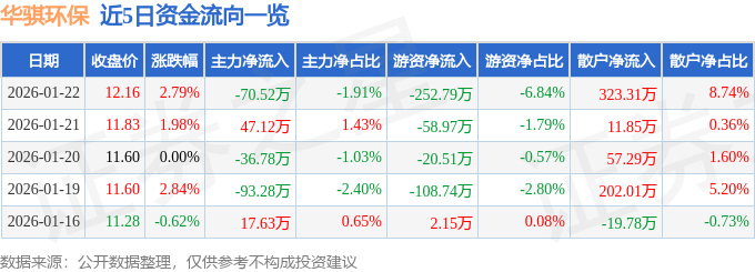 证券之星消息,截至2026年1月22日收盘,华骐环保(300929)报收于12.16元,上涨2.79%,换手率2.43%,成交量3.07万手,成交额3697.32万元。