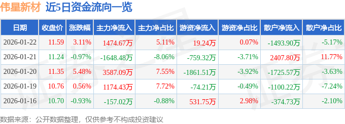 证券之星消息,截至2026年1月22日收盘,伟星新材(002372)报收于11.59元,上涨3.11%,换手率1.7%,成交量25.01万手,成交额2.89亿元。