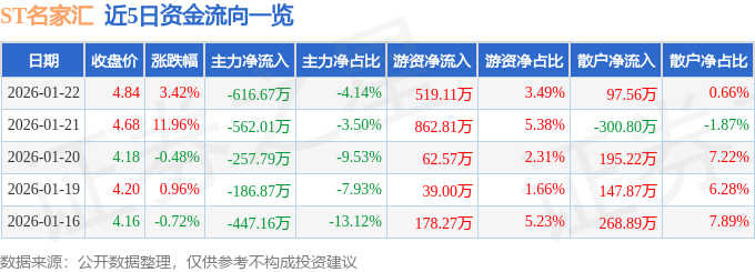 证券之星消息,截至2026年1月22日收盘,ST名家汇(300506)报收于4.84元,上涨3.42%,换手率4.12%,成交量30.27万手,成交额1.49亿元。