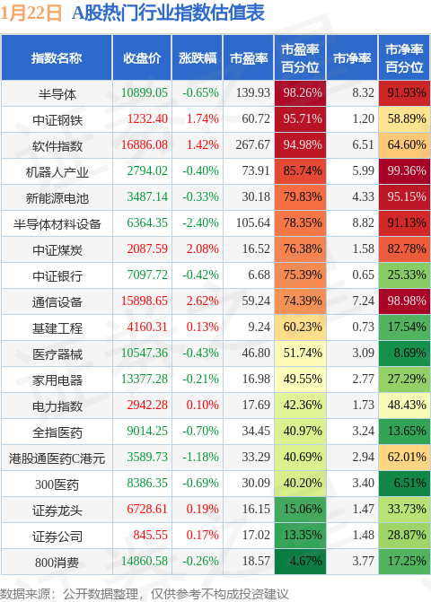 热门行业指数方面,半导体的市盈率百分位较高,为98.26%。而800消费的市盈率百分位较低,为4.67%。