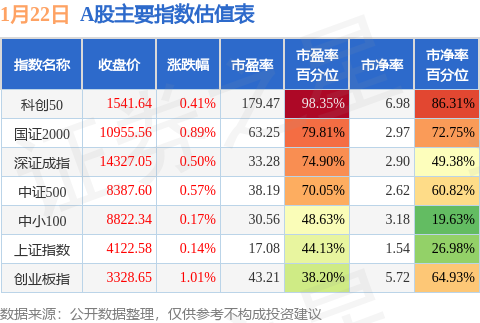 A股主要宽基指数方面,科创50的市盈率百分位较高,为98.35%。而创业板指的市盈率百分位较低,为38.2%。