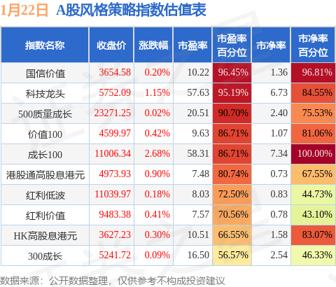 风格策略指数方面,国信价值的市盈率百分位较高,为96.45%。而300成长的市盈率百分位较低,为56.57%。