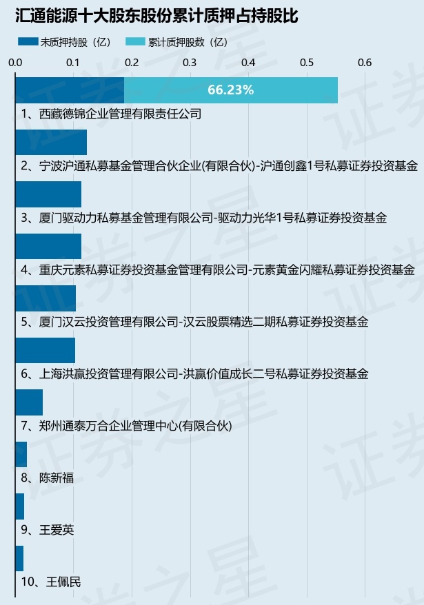 截止本公告日,股东西藏德锦企业管理有限责任公司已累计质押股份3663.0万股,占其持股总数的66.23%。本次质押后汇通能源十大股东的累计质押股份占持股比例(占持股比例的计算以公司最新一期财务报表公布的十大股东的持股总数为基准)见下图: