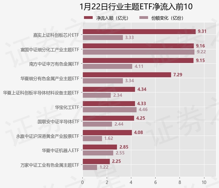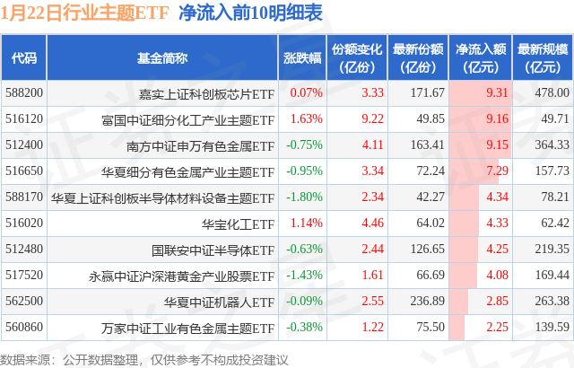 当日有134只行业主题ETF基金出现资金净流入,其中净流入排首位的是嘉实上证科创板芯片ETF(588200),份额增加了3.33亿份,净流入额为9.31亿元。