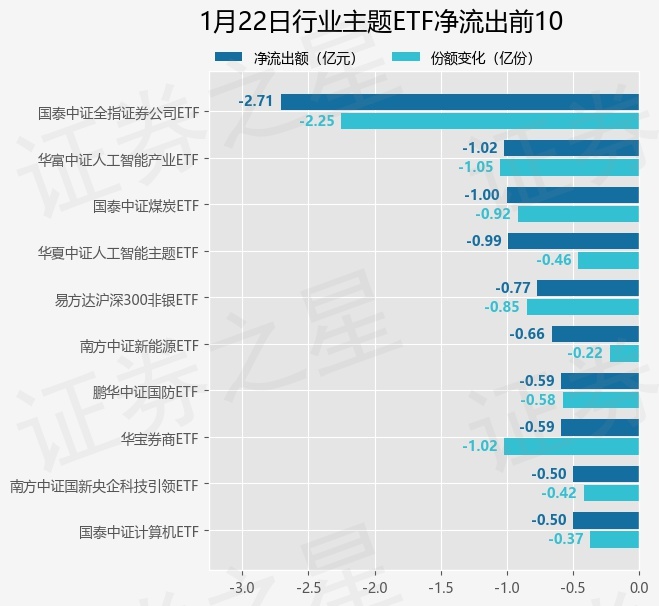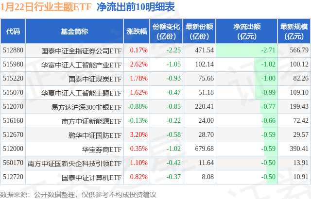 当日有111只行业主题ETF基金出现资金净流出,其中净流出排首位的是国泰中证全指证券公司ETF(512880),份额减少了2.25亿份,净流出额为2.71亿元。