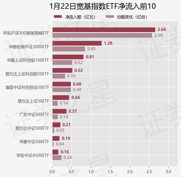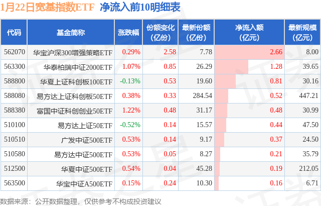 当日有35只宽基指数ETF基金出现资金净流入,其中净流入排首位的是华宝沪深300增强策略ETF(562070),份额增加了2.58亿份,净流入额为2.66亿元。