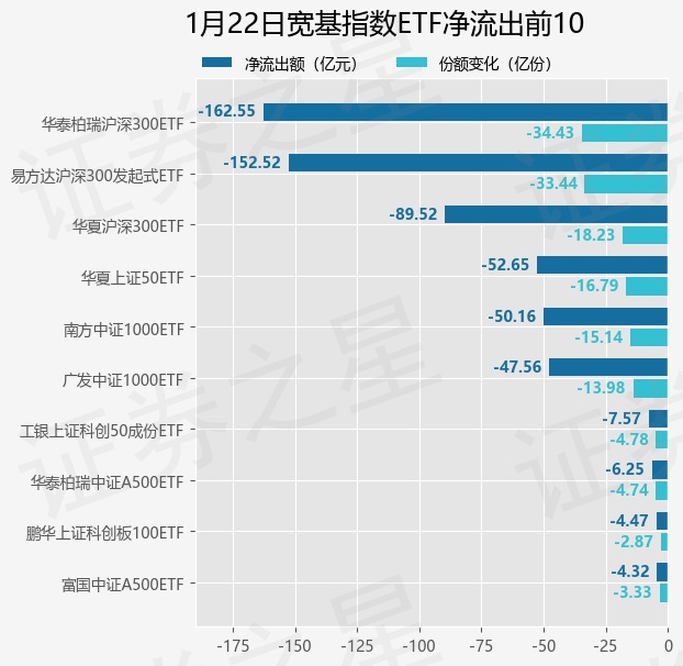 当日有76只宽基指数ETF基金出现资金净流出,其中净流出排首位的是华泰柏瑞沪深300ETF(510300),份额减少了34.43亿份,净流出额为162.55亿元。