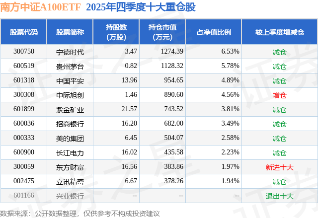 南方中证A100ETF基金成立于2024年12月19日,基金经理为龚涛,基金跟踪标的为中证A100指数,成立以来超额回报为2.49%,近一个月超额回报为0.14%。最新披露的基金持仓数据显示,截止2025年12月31日,该基金第一大重仓股为宁德时代(300750),持股占比为6.53%。