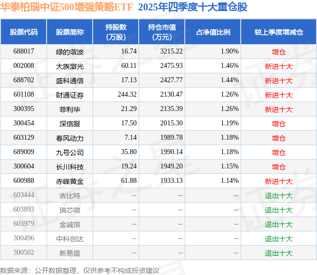 华泰柏瑞中证500增强策略ETF基金成立于2021年12月2日,基金经理为柳军 笪篁,基金跟踪标的为中证500指数,成立以来超额回报为26.33%,近一个月超额回报为-2.03%。最新披露的基金持仓数据显示,截止2025年12月31日,该基金第一大重仓股为绿的谐波(688017),持股占比为1.9%。