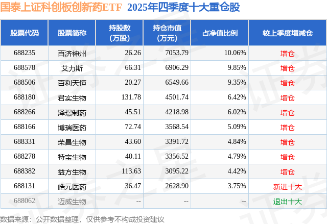 国泰上证科创板创新药ETF基金成立于2025年7月23日,基金经理为麻绎文,基金跟踪标的为上证科创板创新药指数,成立以来超额回报为-1.97%,近一个月超额回报为-0.03%。最新披露的基金持仓数据显示,截止2025年12月31日,该基金第一大重仓股为百济神州(688235),持股占比为10.06%。