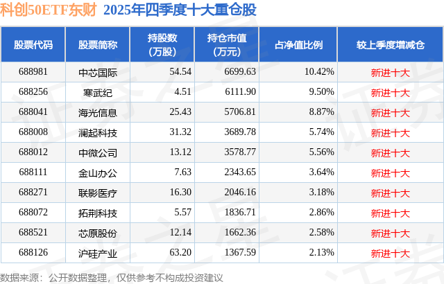 科创50ETF东财基金成立于2025年8月1日,基金经理为吴逸,基金跟踪标的为上证科创板50成份指数,成立以来超额回报为-0.18%,近一个月超额回报为0.11%。最新披露的基金持仓数据显示,截止2025年12月31日,该基金第一大重仓股为中芯国际(688981),持股占比为10.42%。