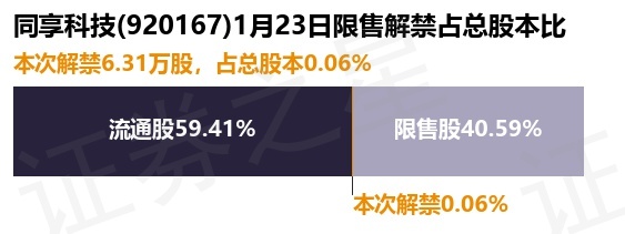 证券之星消息,根据市场公开信息整理,同享科技(920167)于1月23日将有6.31万股限售股份解禁,为公司股权激励期权行权,占公司总股本0.06%。(本次数据根据历史公告整理得出,实际情况以上市公司最新公告为准)本次解禁后,公司还有4466.27万股限售股份,占总股本40.59%。具体如下图所示: