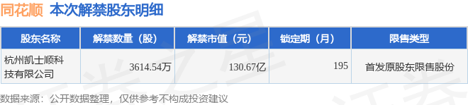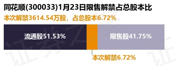 证券之星消息,根据市场公开信息整理,同花顺(300033)于1月23日将有3614.54万股限售股份解禁,为公司首发原股东限售股份,占公司总股本6.72%。(本次数据根据历史公告整理得出,实际情况以上市公司最新公告为准)本次解禁后,公司还有2.24亿股限售股份,占总股本41.75%。具体如下图所示: