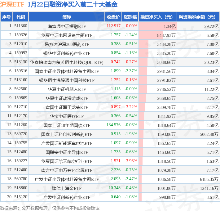 沪深ETF融资净买入前三分别为:海富通中证短融ETF(511360)融资净买入1.34亿元、华夏中证电网设备主题ETF(159326)融资净买入8437.93万元、易方达沪深300医药ETF(512010)融资净买入3434.28万元,前20具体见下表: