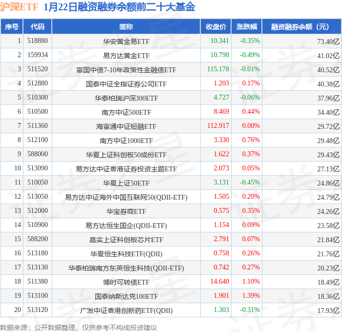 沪深ETF融资融券余额前三分别为:华安黄金易ETF(518880)融资融券余额73.4亿元、易方达黄金ETF(159934)融资融券余额41.02亿元、富国中债7-10年政策性金融债ETF(511520)融资融券余额40.52亿元,前20具体见下表: