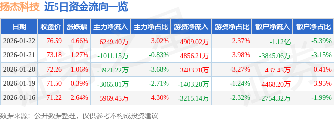 证券之星消息,截至2026年1月22日收盘,扬杰科技(300373)报收于76.59元,上涨4.66%,换手率5.1%,成交量27.67万手,成交额20.7亿元。