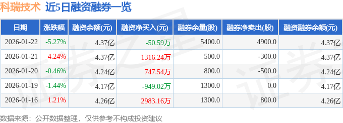 科瑞技术融资融券信息显示,融资方面,当日融资买入6968.75万元,融资偿还7019.34万元,融资净偿还50.59万元。融券方面,融券卖出4900.0股,融券偿还0.0股,融券余量5400.0股,融券余额12.71万元。融资融券余额4.37亿元。
