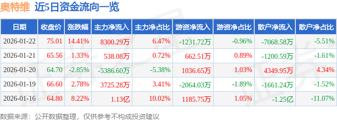 1月22日的资金流向数据方面,主力资金净流入8300.29万元,占总成交额6.47%,游资资金净流出1231.72万元,占总成交额0.96%,散户资金净流出7068.58万元,占总成交额5.51%。