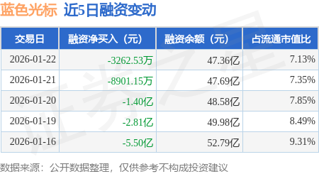 证券之星消息,1月22日,蓝色光标(300058)融资买入11.87亿元,融资偿还12.2亿元,融资净卖出3262.53万元,融资余额47.36亿元,近20个交易日中有13个交易日出现融资净买入。
