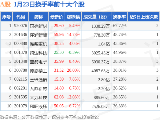 当日A股换手率前10大个股中9只个股收涨,平均涨幅9.57%,其中国亮新材(920076)以换手率67.72%排第一,4只个股近5个交易日中多次上榜。