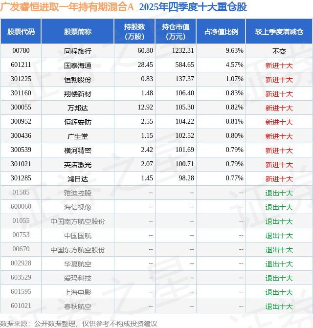 广发睿恒进取一年持有期混合A的前十大重仓股如下: