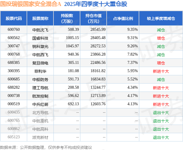 国投瑞银国家安全混合A的前十大重仓股如下: