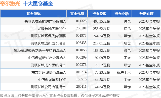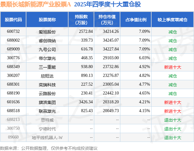 根据2025基金年报公募基金重仓股数据,重仓该股的公募基金共15家,其中持有数量最多的公募基金为景顺长城基金的景顺长城新能源产业股票A。景顺长城新能源产业股票A目前规模为20.37亿元,最新净值1.4906(1月22日),较上一交易日上涨0.76%,近一年上涨33.63%。该公募基金现任基金经理为杨锐文 曾英捷。杨锐文在任的基金产品包括:景顺长城优选混合,管理时间为2014年10月25日至今,期间收益率为356.44%;景顺长城环保优势股票,管理时间为2016年3月15日至今,期间收益率为341.2%;景顺长城创新成长混合,管理时间为2019年10月17日至今,期间收益率为112.57%;景顺长城成长领航混合,管理时间为2020年5月28日至今,期间收益率为78.57%。曾英捷在任的基金产品包括:景顺长城精锐成长混合A,管理时间为2025年11月21日至今,期间收益率为22.4%。