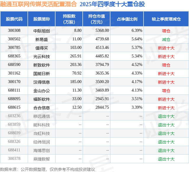 融通互联网传媒灵活配置混合的前十大重仓股如下: