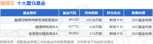 根据2025基金年报公募基金重仓股数据,重仓该股的公募基金共3家,其中持有数量最多的公募基金为融通基金的融通互联网传媒灵活配置混合。融通互联网传媒灵活配置混合目前规模为8.4亿元,最新净值1.346(1月22日),较上一交易日上涨1.05%,近一年上涨73.68%。该公募基金现任基金经理为张鹏。张鹏在任的基金产品包括:融通明锐混合A,管理时间为2025年2月21日至今,期间收益率为66.49%。