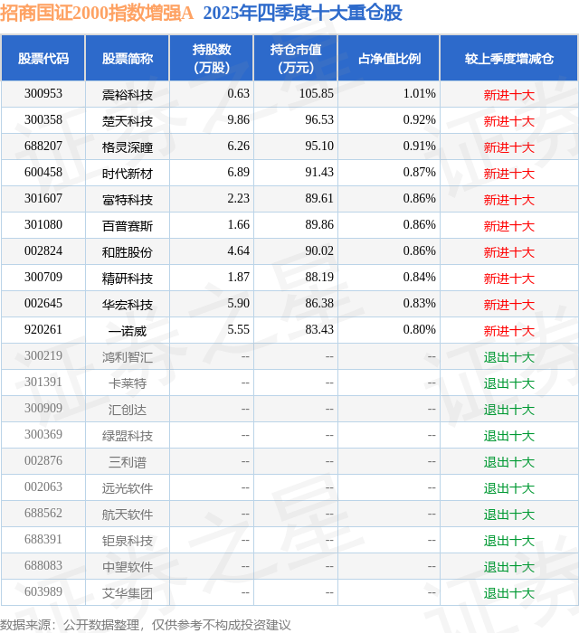 根据2025基金Q3季报公募基金重仓股数据,重仓该股的公募基金共1家,其中持有数量最多的公募基金为招商基金的招商国证2000指数增强A。招商国证2000指数增强A目前规模为0.35亿元,最新净值1.6565(1月22日),较上一交易日上涨0.71%,近一年上涨55.58%。该公募基金现任基金经理为邓童。邓童在任的基金产品包括:招商中证500指数增强A,管理时间为2021年11月23日至今,期间收益率为37.76%;招商中证煤炭等权指数(LOF)C,管理时间为2021年12月2日至今,期间收益率为38.17%;招商大宗商品(LOF),管理时间为2021年12月2日至今,期间收益率为45.14%;招商北证50成份指数发起式A,管理时间为2022年12月22日至今,期间收益率为58.99%。