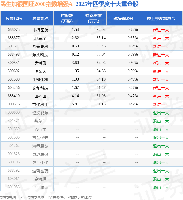 民生加银国证2000指数增强A的前十大重仓股如下: