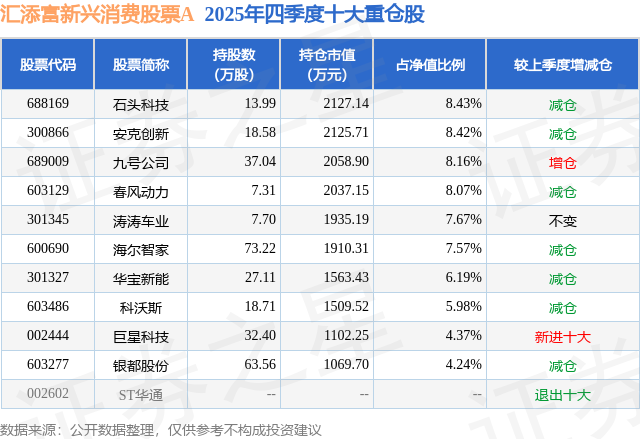 根据2025基金年报公募基金重仓股数据,重仓该股的公募基金共1家,其中持有数量最多的公募基金为汇添富基金的汇添富新兴消费股票A。汇添富新兴消费股票A目前规模为2.21亿元,最新净值1.48(1月22日),较上一交易日下跌0.6%,近一年上涨3.56%。该公募基金现任基金经理为周晗。周晗在任的基金产品包括:汇添富品牌价值一年持有混合A,管理时间为2025年10月17日至今,期间收益率为-2.13%;