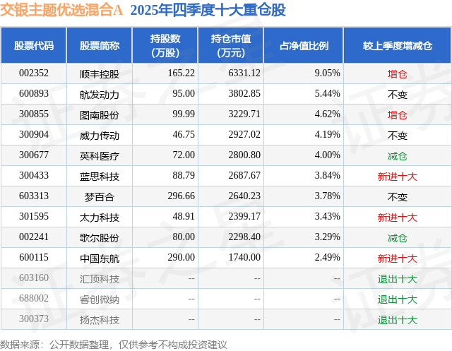 根据2025基金年报公募基金重仓股数据,重仓该股的公募基金共1家,其中持有数量最多的公募基金为交银施罗德基金的交银主题优选混合A。交银主题优选混合A目前规模为6.92亿元,最新净值2.385(1月22日),较上一交易日上涨1.07%,近一年上涨36.28%。该公募基金现任基金经理为沈楠。沈楠在任的基金产品包括:交银国企改革灵活配置混合A,管理时间为2015年6月10日至今,期间收益率为150.49%;交银瑞思混合(LOF),管理时间为2020年2月21日至今,期间收益率为37.92%。
