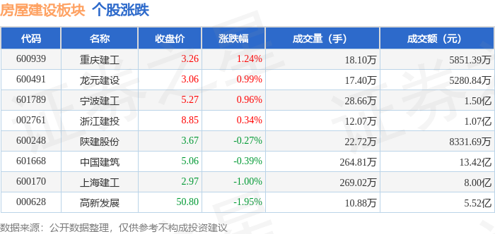 证券之星消息,1月23日房屋建设板块较上一交易日下跌0.39%,高新发展领跌。当日上证指数报收于4136.16,上涨0.33%。深证成指报收于14439.66,上涨0.79%。房屋建设板块个股涨跌见下表: