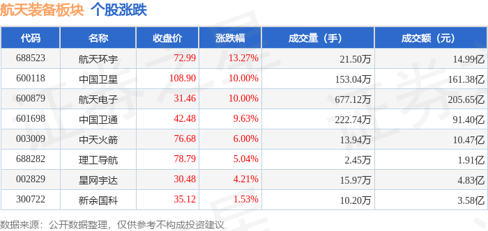 从资金流向上来看,当日航天装备板块主力资金净流入38.33亿元,游资资金净流出15.33亿元,散户资金净流出23.0亿元。航天装备板块个股资金流向见下表: