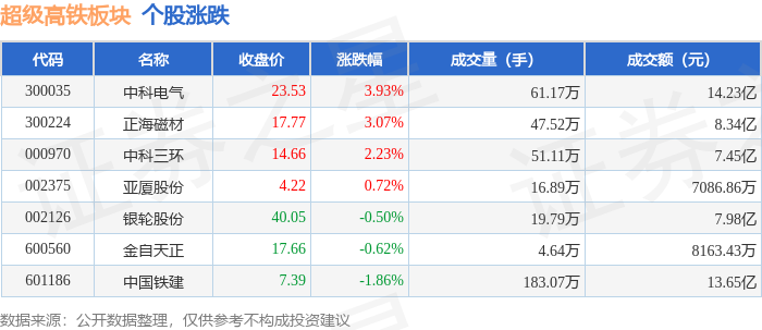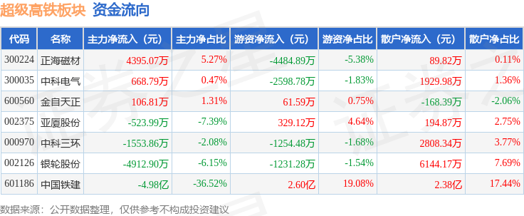 从资金流向上来看,当日超级高铁板块主力资金净流出5.17亿元,游资资金净流入1.69亿元,散户资金净流入3.48亿元。超级高铁板块个股资金流向见下表: