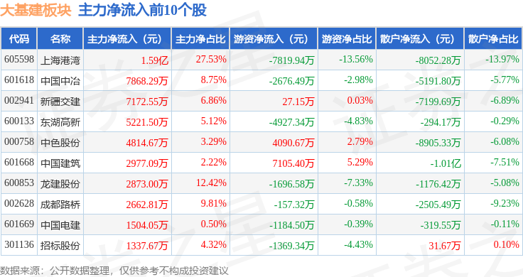 从资金流向上来看,当日大基建板块主力资金净流出19.45亿元,游资资金净流入7.78亿元,散户资金净流入11.67亿元。大基建板块个股资金流向见下表: