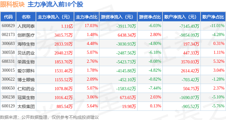 从资金流向上来看,当日眼科板块主力资金净流出8.49亿元,游资资金净流出8641.27万元,散户资金净流入9.36亿元。眼科板块个股资金流向见下表: