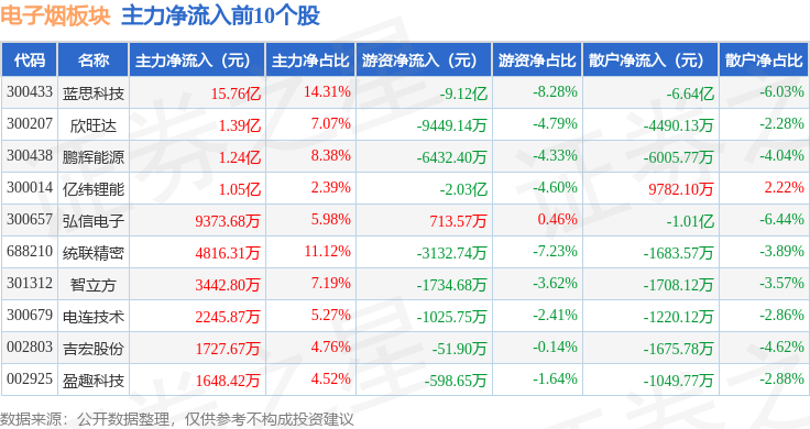 从资金流向上来看,当日电子烟板块主力资金净流出1.1亿元,游资资金净流出9.06亿元,散户资金净流入10.16亿元。电子烟板块个股资金流向见下表: