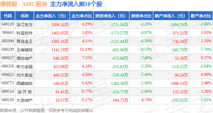 从资金流向上来看,当日债转股 · AMC板块主力资金净流出5.6亿元,游资资金净流出1.91亿元,散户资金净流入7.51亿元。债转股 · AMC板块个股资金流向见下表: