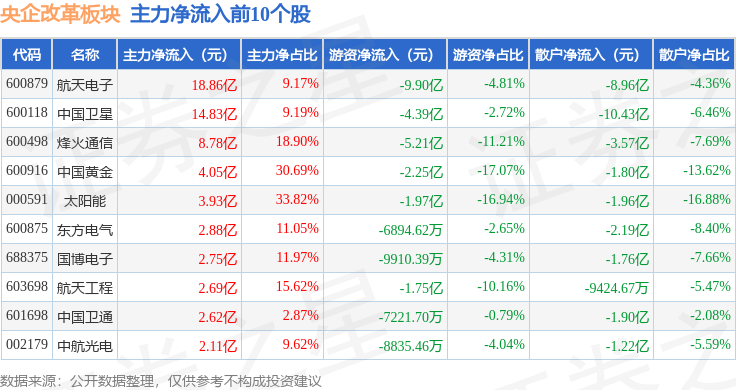 从资金流向上来看,当日央企改革板块主力资金净流出36.78亿元,游资资金净流出1.2亿元,散户资金净流入37.99亿元。央企改革板块个股资金流向见下表: