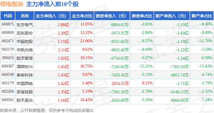 从资金流向上来看,当日核电板块主力资金净流出43.63亿元,游资资金净流入4.84亿元,散户资金净流入38.79亿元。核电板块个股资金流向见下表: