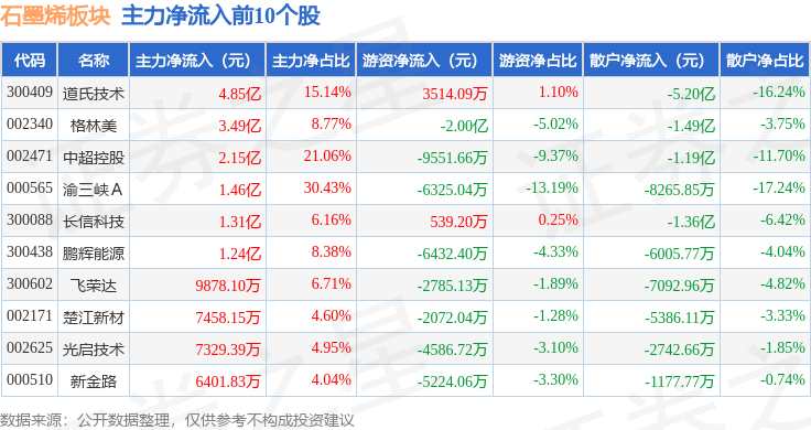 从资金流向上来看,当日石墨烯板块主力资金净流入14.08亿元,游资资金净流出10.85亿元,散户资金净流出3.23亿元。石墨烯板块个股资金流向见下表: