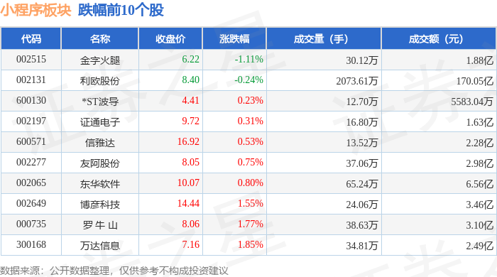 从资金流向上来看,当日小程序板块主力资金净流出31.03亿元,游资资金净流入9.68亿元,散户资金净流入21.35亿元。小程序板块个股资金流向见下表: